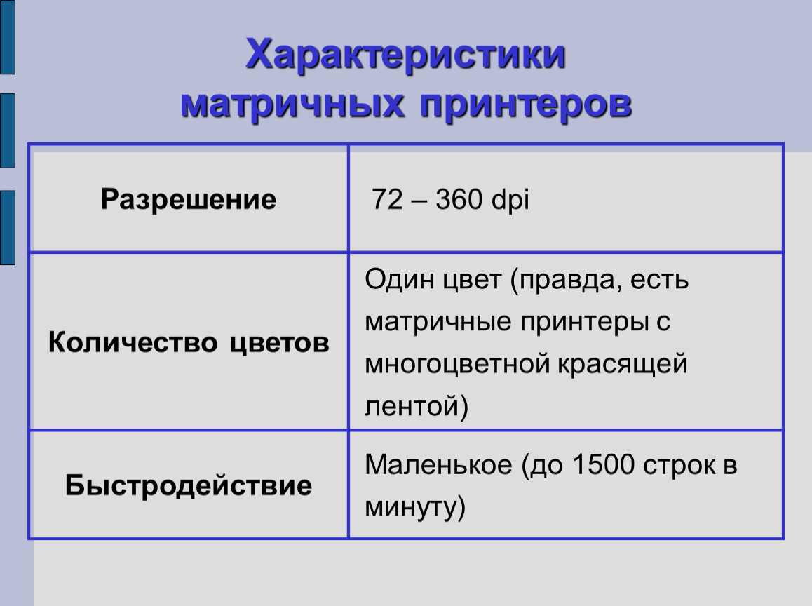 Характеристики матричных принтеров