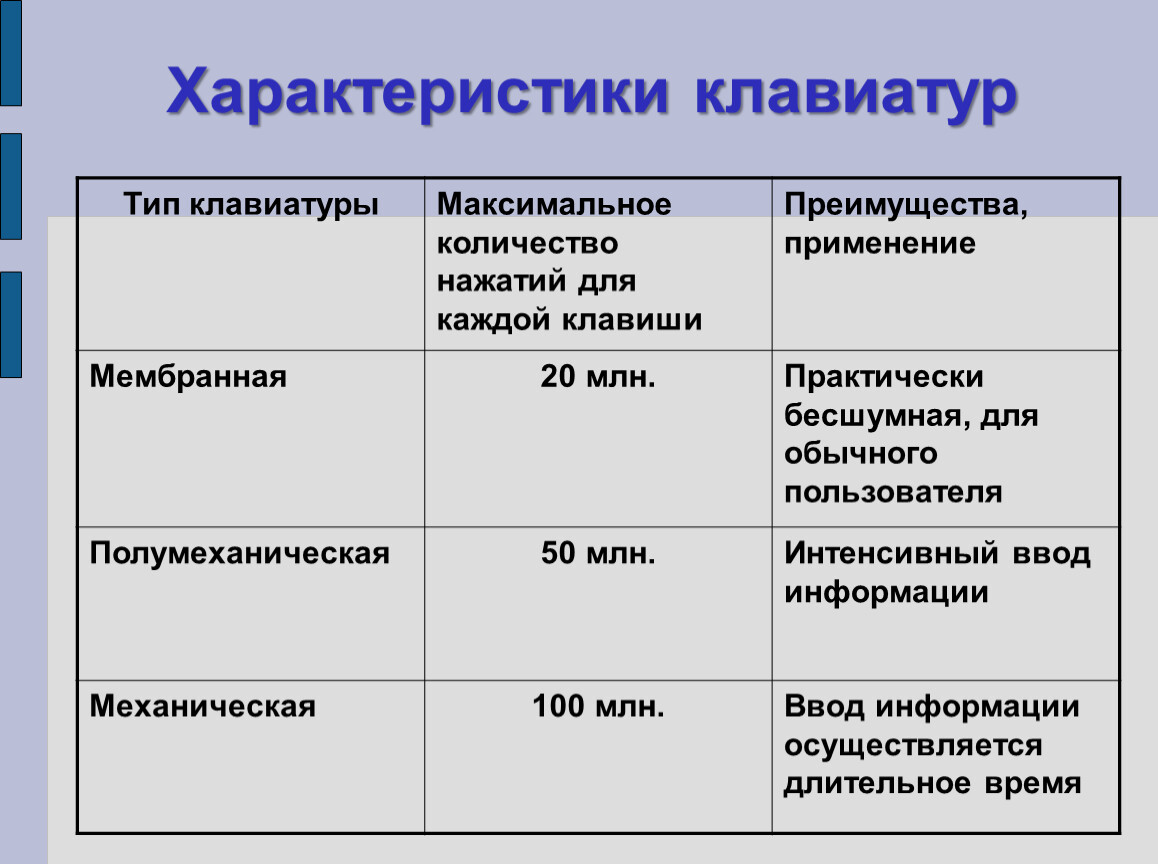 Тип клавиатуры | Максимальное количество нажатий для каждой клавиши | Преимущества, применение |