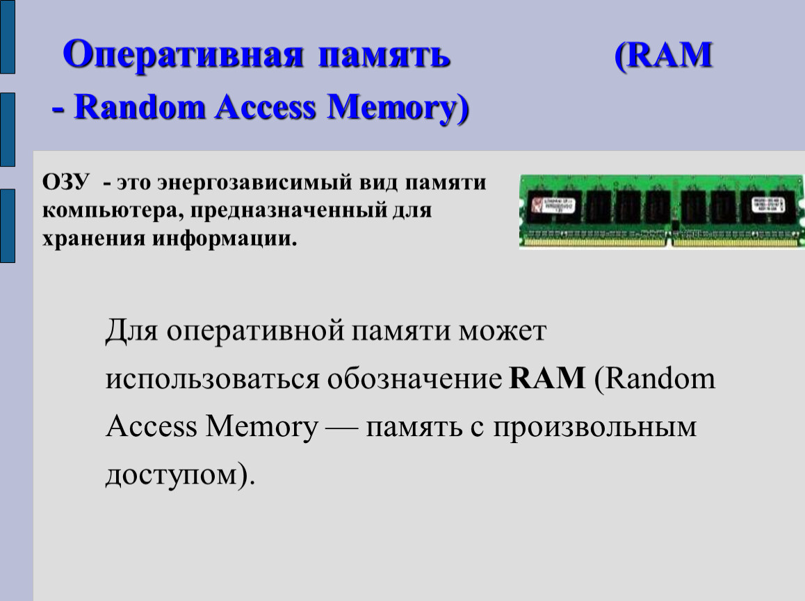 ОЗУ - это энергозависимый вид памяти компьютера, предназначенный для хранения информации.