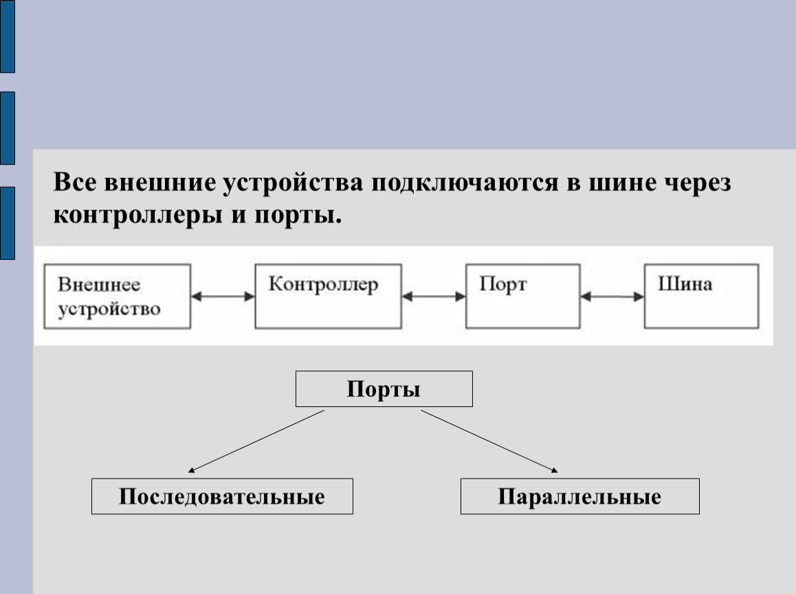 Все внешние устройства подключаются в шине через контроллеры и порты.
