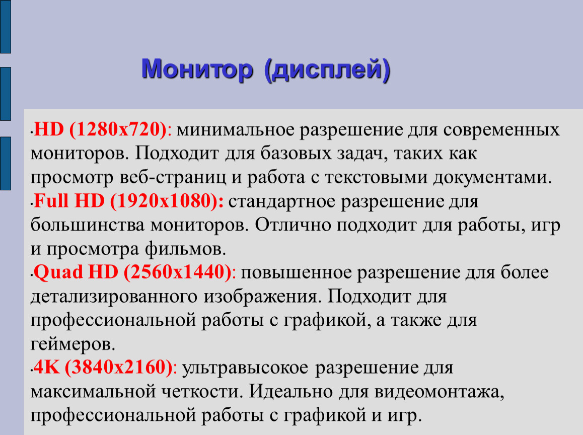 HD (1280x720): минимальное разрешение для современных мониторов. Подходит для базовых задач, таких как просмотр веб-страниц и работа с текстовыми документами.