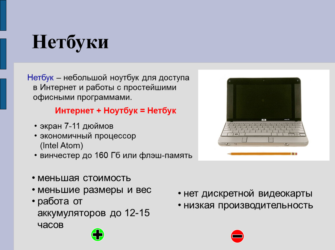 Нетбук – небольшой ноутбук для доступа в Интернет и работы с простейшими офисными программами.