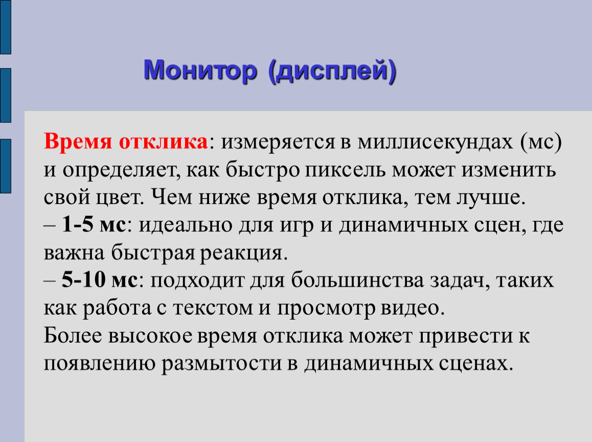 Время отклика: измеряется в миллисекундах (мс) и определяет, как быстро пиксель может изменить свой цвет. Чем ниже время отклика, тем лучше.