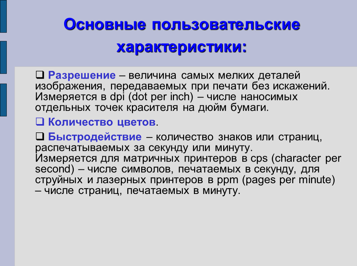 Быстродействие – количество знаков или страниц, распечатываемых за секунду или минуту. Измеряется для матричных принтеров в cps (character per second) – числе символов, печатаемых в секунду, для струйных и лазерных принтеров в ppm (pages per minute) – числе страниц, печатаемых в минуту.