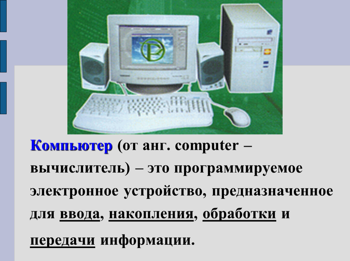 Компьютер (от анг. computer – вычислитель) – это программируемое электронное устройство, предназначенное для ввода, накопления, обработки и передачи информации.