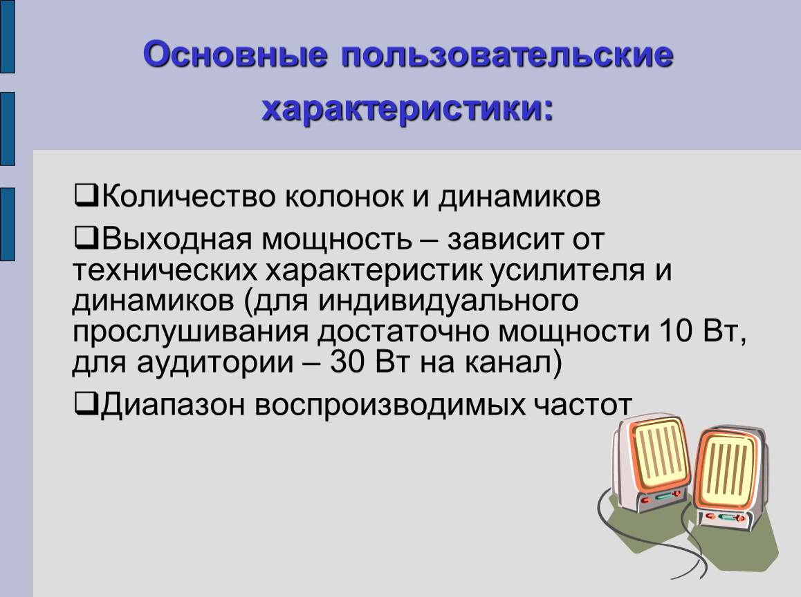 Выходная мощность – зависит от технических характеристик усилителя и динамиков (для индивидуального прослушивания достаточно мощности 10 Вт, для аудитории – 30 Вт на канал)