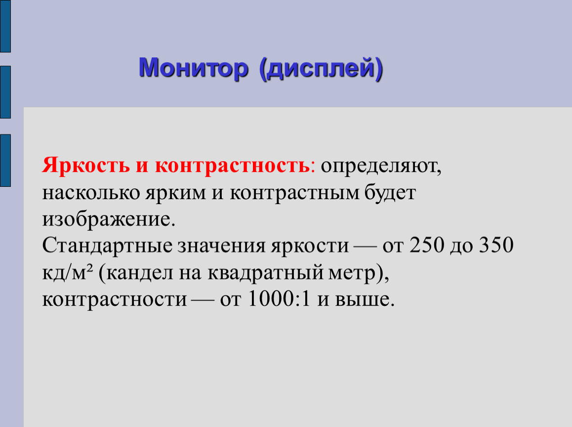 Стандартные значения яркости — от 250 до 350 кд/м² (кандел на квадратный метр),