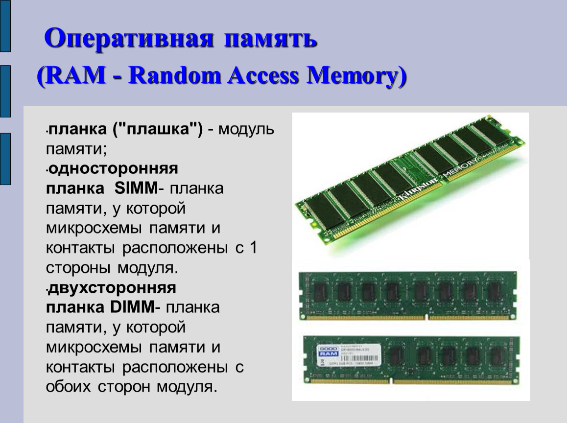 двухсторонняя планка DIMM- планка памяти, у которой микросхемы памяти и контакты расположены с обоих сторон модуля.