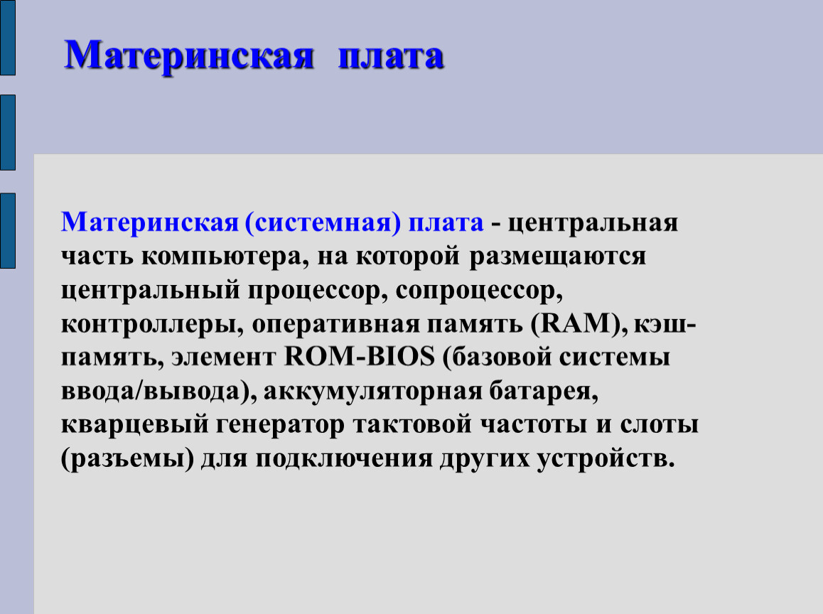 Материнская (системная) плата - центральная часть компьютера, на которой размещаются центральный процессор, сопроцессор, контроллеры, оперативная память (RAM), кэш-память, элемент ROM-BIOS (базовой системы ввода/вывода), аккумуляторная батарея, кварцевый генератор тактовой частоты и слоты (разъемы) для подключения других устройств.
