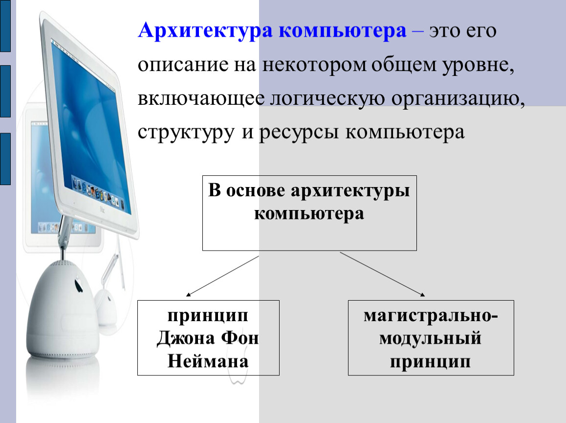Архитектура компьютера – это его описание на некотором общем уровне, включающее логическую организацию, структуру и ресурсы компьютера