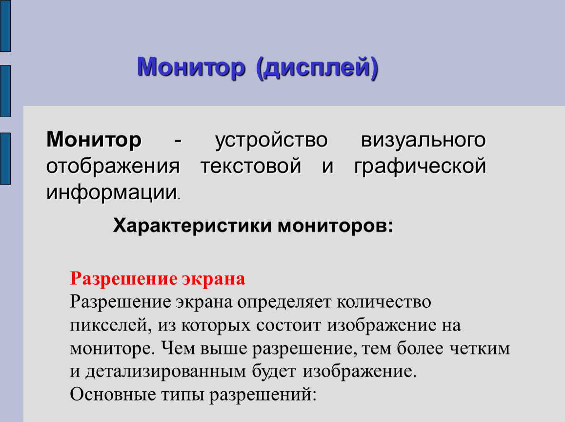 Монитор - устройство визуального отображения текстовой и графической информации.