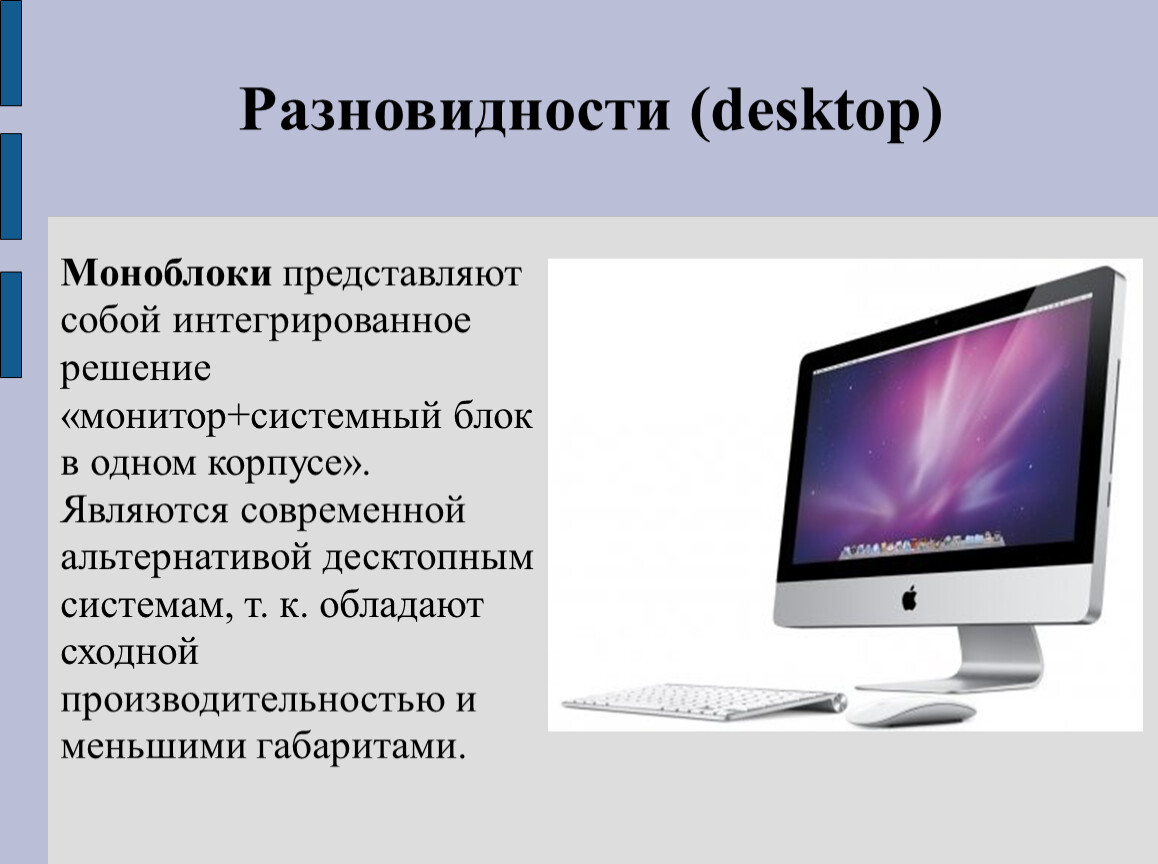 Моноблоки представляют собой интегрированное решение «монитор+системный блок в одном корпусе». Являются современной альтернативой десктопным системам, т. к. обладают сходной производительностью и меньшими габаритами.