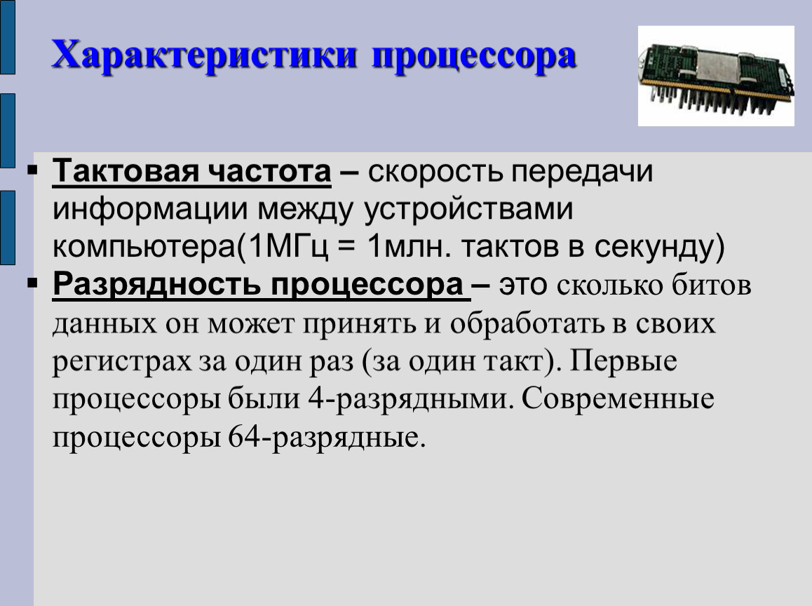 Разрядность процессора – это сколько битов данных он может принять и обработать в своих регистрах за один раз (за один такт). Первые процессоры были 4-разрядными. Современные процессоры 64-разрядные.