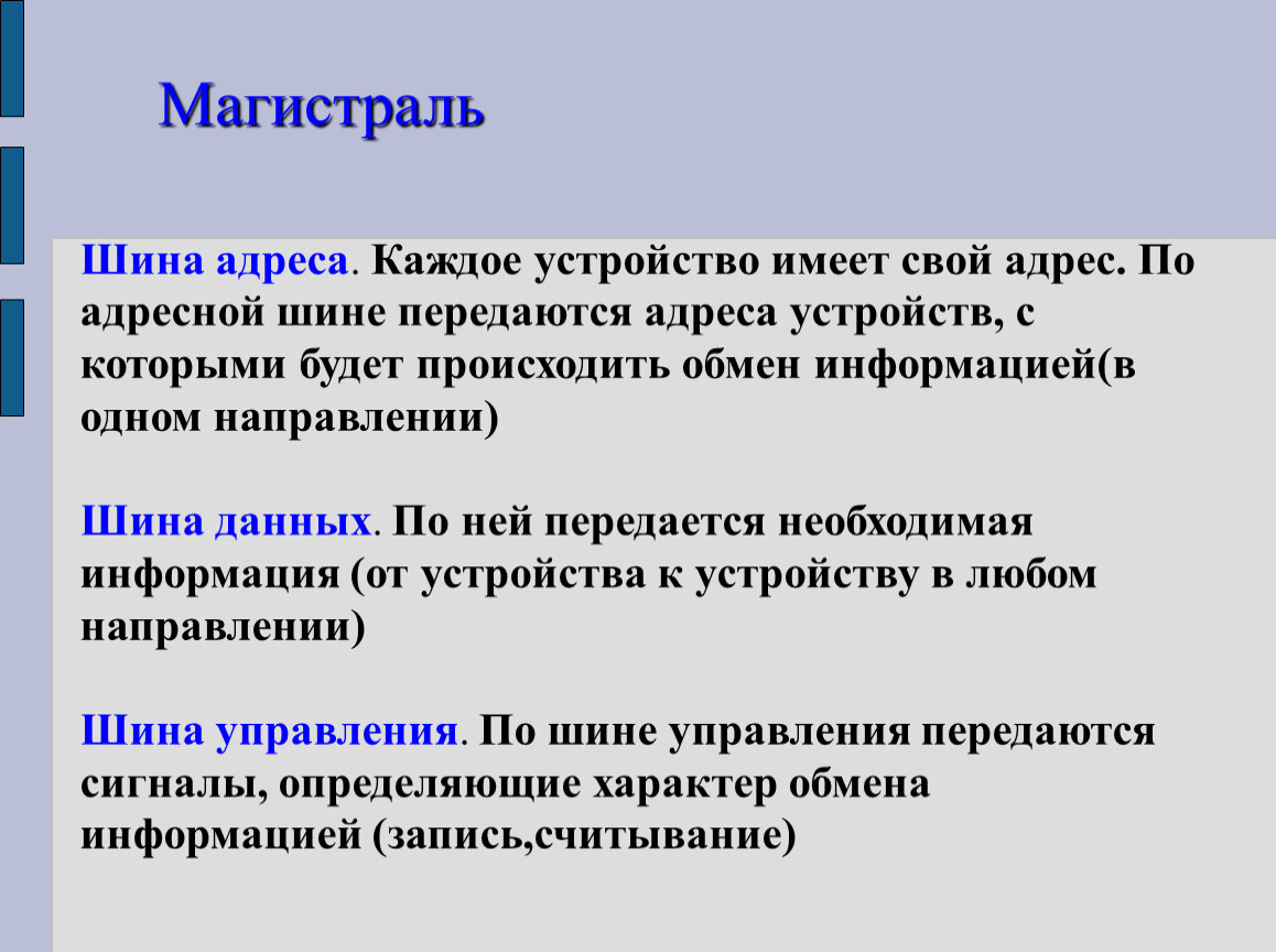 Шина адреса. Каждое устройство имеет свой адрес. По адресной шине передаются адреса устройств, с которыми будет происходить обмен информацией(в одном направлении)