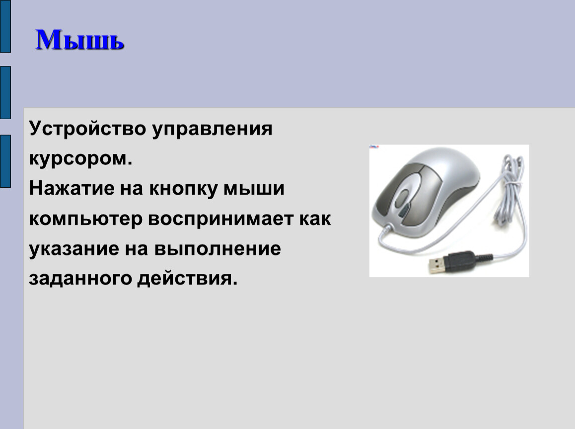 Нажатие на кнопку мыши компьютер воспринимает как указание на выполнение заданного действия.