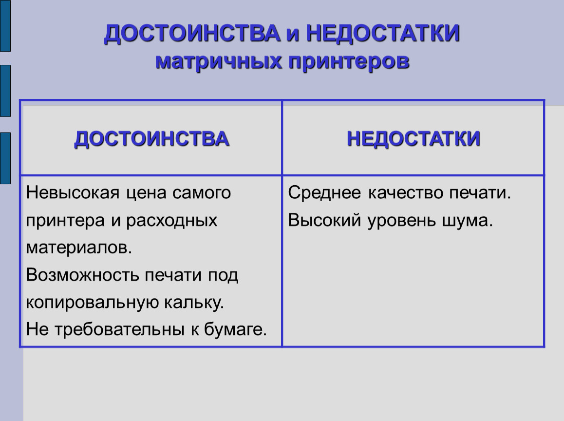 ДОСТОИНСТВА и НЕДОСТАТКИ матричных принтеров