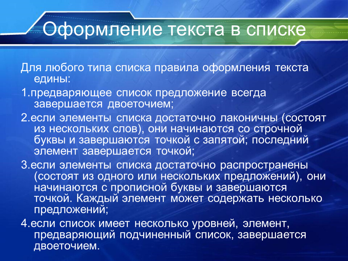 4.если список имеет несколько уровней, элемент, предваряющий подчиненный список, завершается двоеточием.