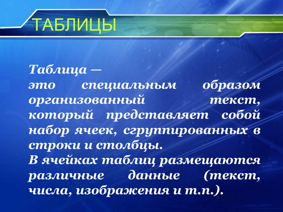 это специальным образом организованный текст, который представляет собой набор ячеек, сгруппированных в строки и столбцы.