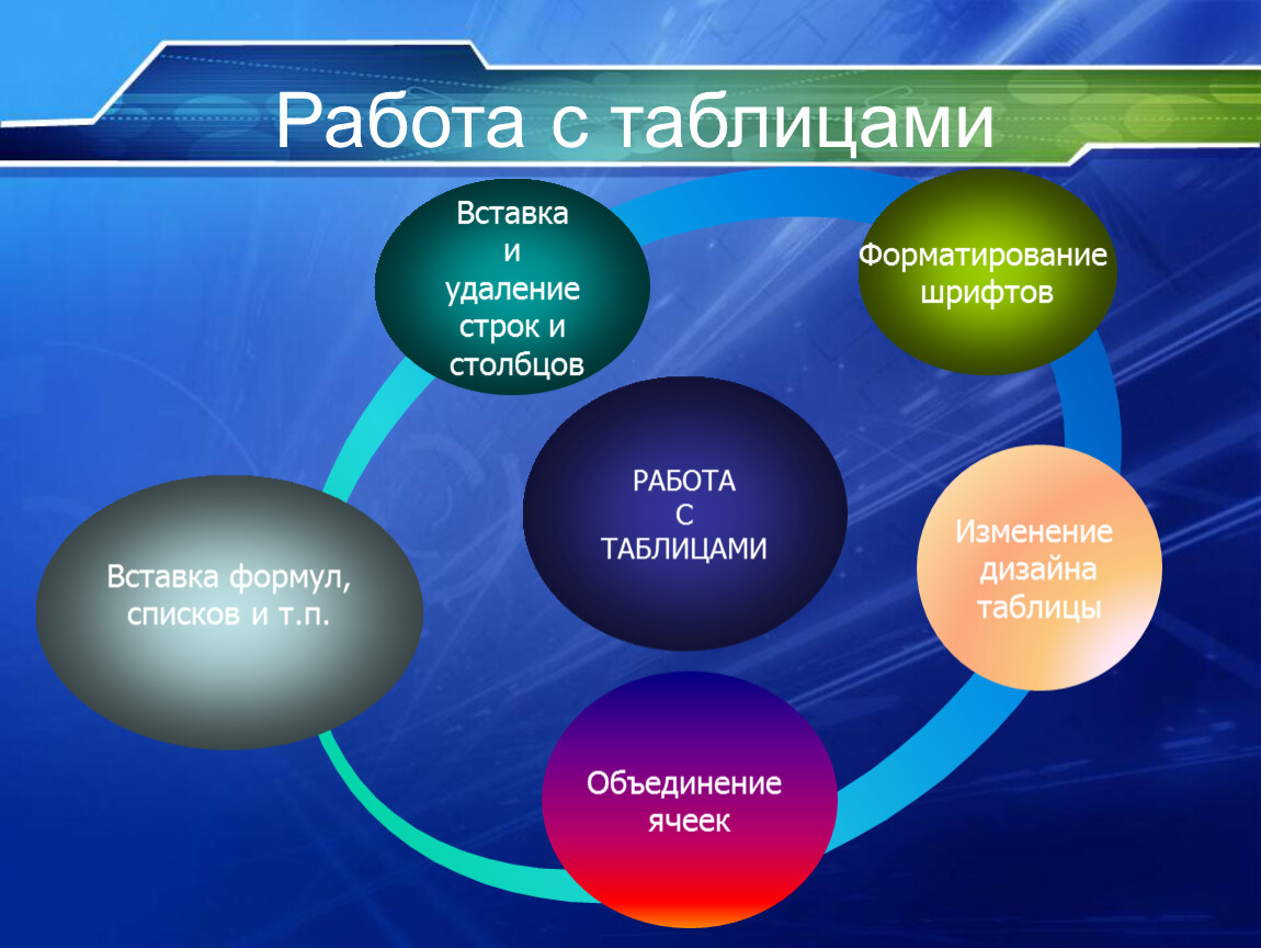 В ячейках таблиц размещаются различные данные (текст, числа, изображения и т.п.).