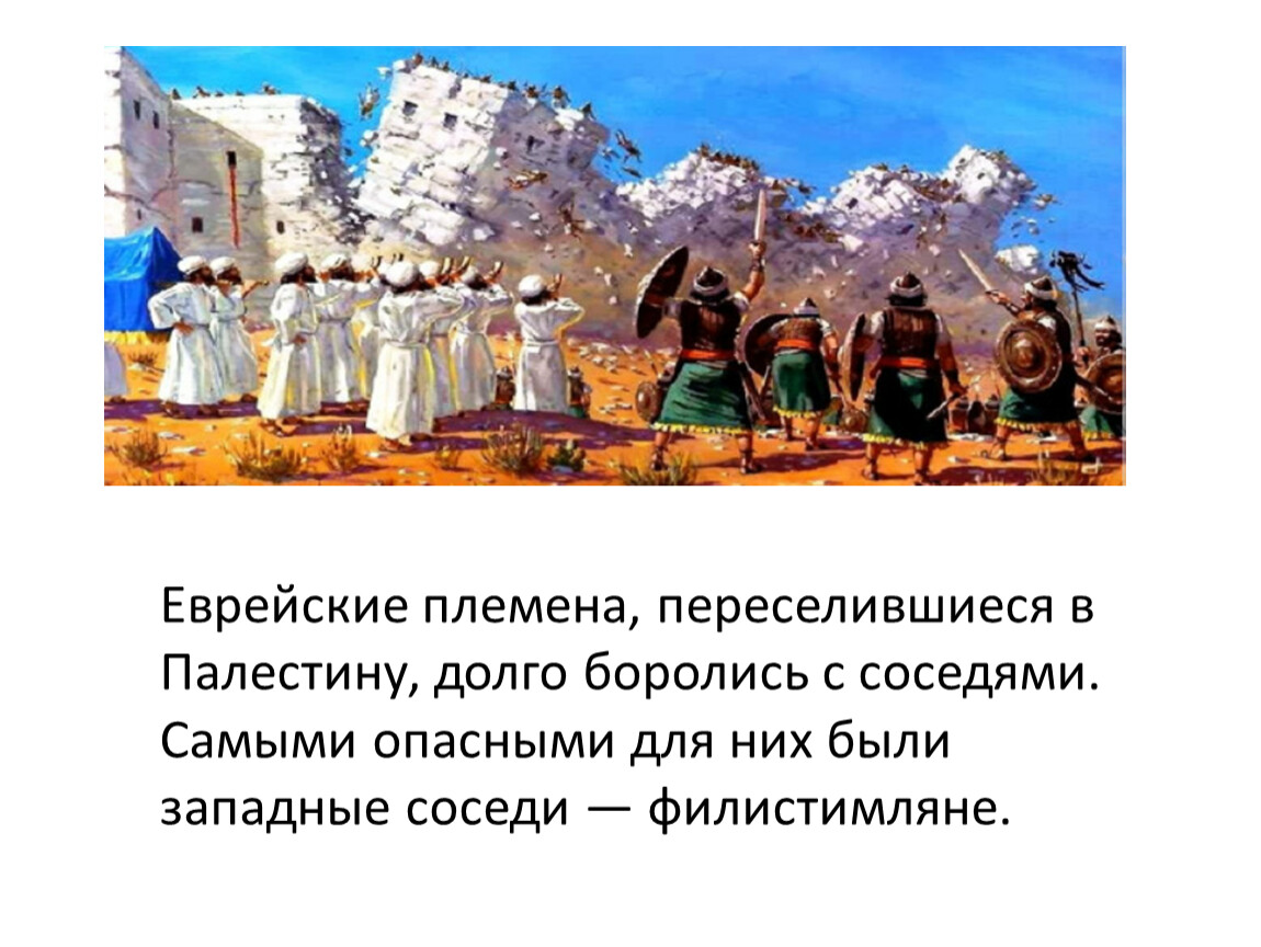 Еврейские племена, переселившиеся в Палестину, долго боролись с соседями. Самыми опасными для них были западные соседи — филистимляне.