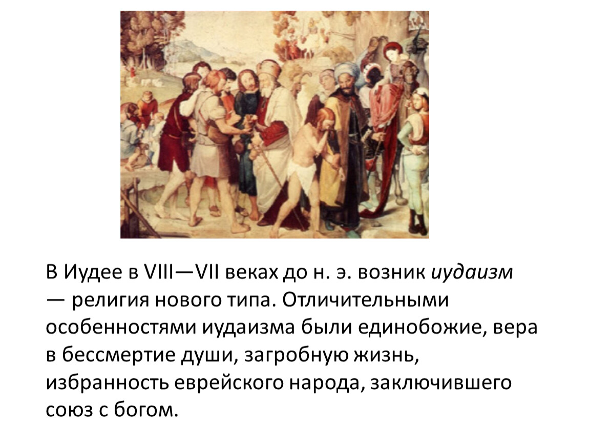 В Иудее в VIII—VII веках до н. э. возник иудаизм — религия нового типа. Отличительными особенностями иудаизма были единобожие, вера в бессмертие души, загробную жизнь, избранность еврейского народа, заключившего союз с богом.