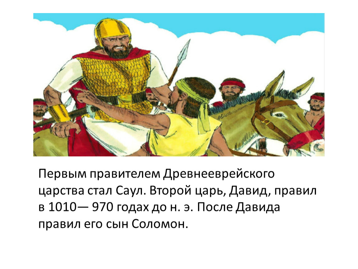 Первым правителем Древнееврейского царства стал Саул. Второй царь, Давид, правил в 1010— 970 годах до н. э. После Давида правил его сын Соломон.
