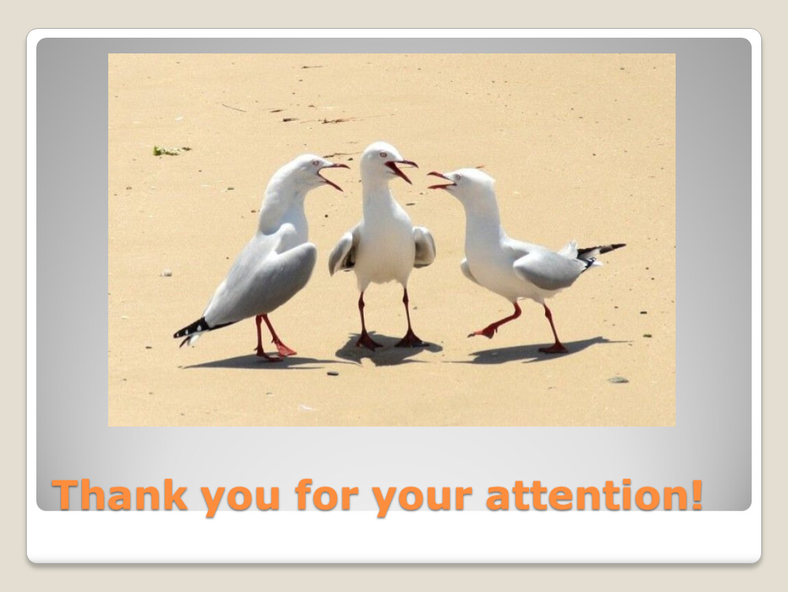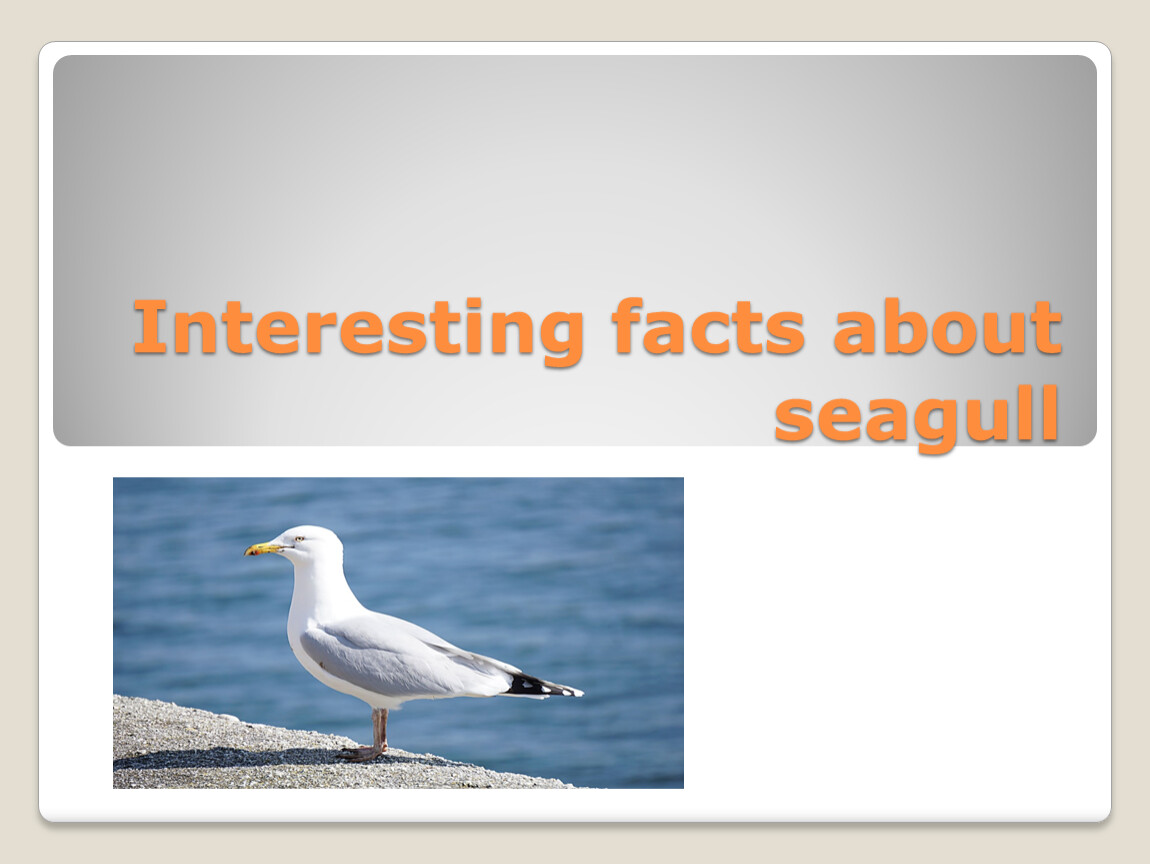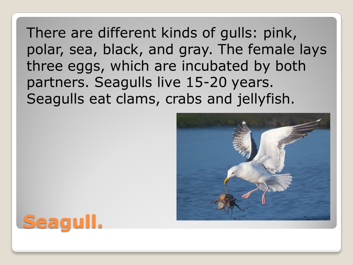 There are different kinds of gulls: pink, polar, sea, black, and gray. The female lays three eggs, which are incubated by both partners. Seagulls live 15-20 years. Seagulls eat clams, crabs and jellyfish.
