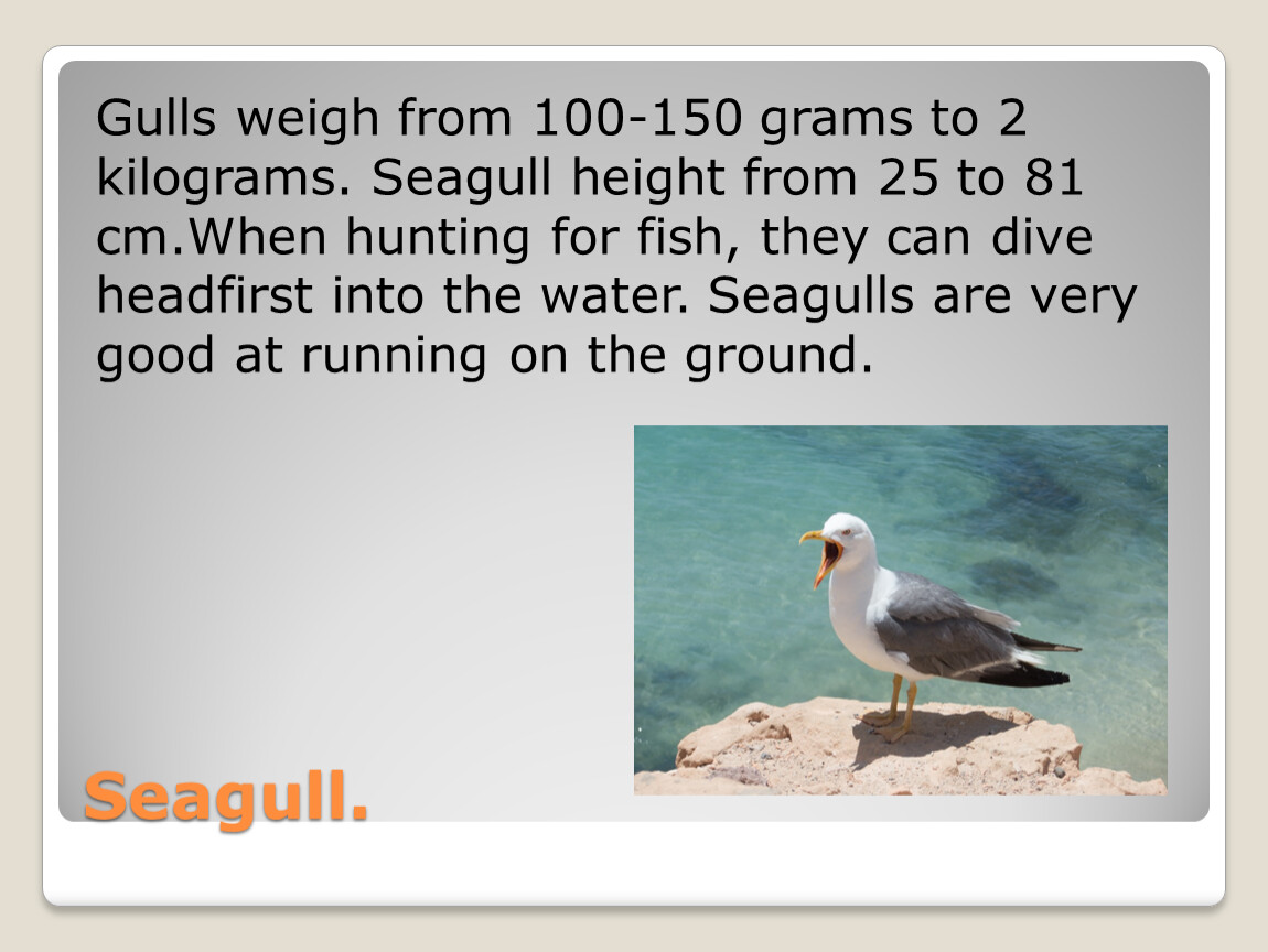 Gulls weigh from 100-150 grams to 2 kilograms. Seagull height from 25 to 81 cm.When hunting for fish, they can dive headfirst into the water. Seagulls are very good at running on the ground.