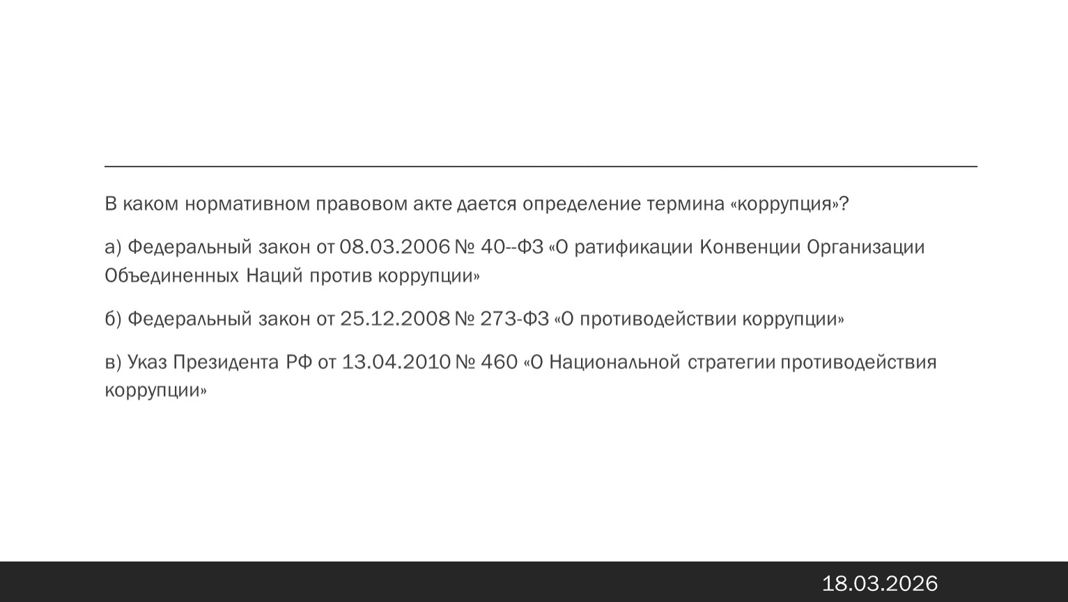 а) Федеральный закон от 08.03.2006 № 40--ФЗ «О ратификации Конвенции Организации Объединенных Наций против коррупции»