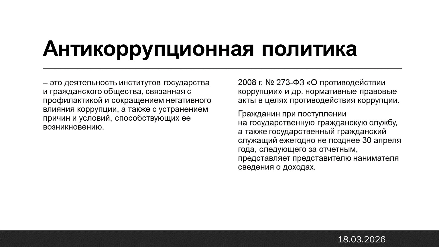 – это деятельность институтов государства и гражданского общества, связанная с профилактикой и сокращением негативного влияния коррупции, а также с устранением причин и условий, способствующих ее возникновению.