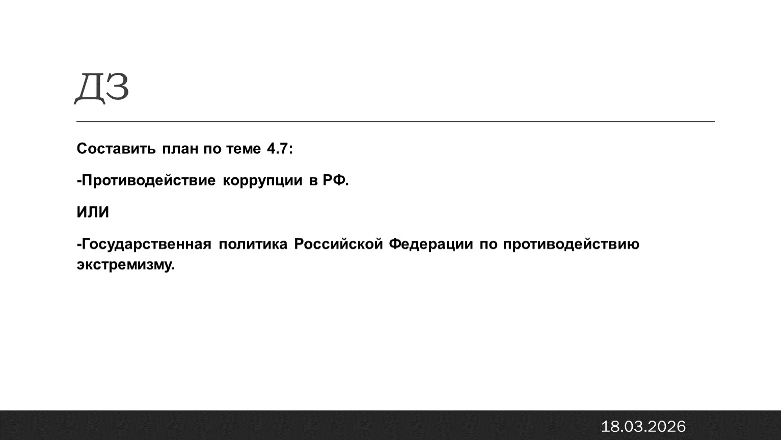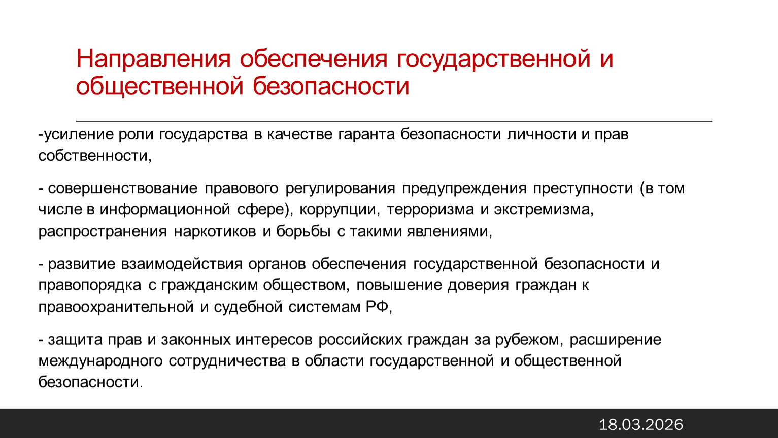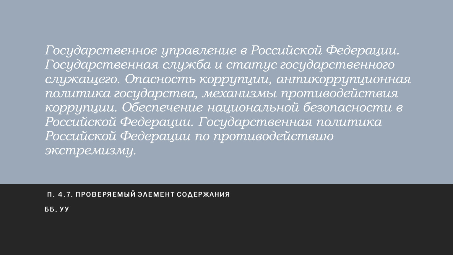 Государственное управление в Российской Федерации. Государственная служба и статус государственного служащего. Опасность коррупции, антикоррупционная политика государства, механизмы противодействия коррупции. Обеспечение национальной безопасности в Российской Федерации. Государственная политика Российской Федерации по противодействию экстремизму.