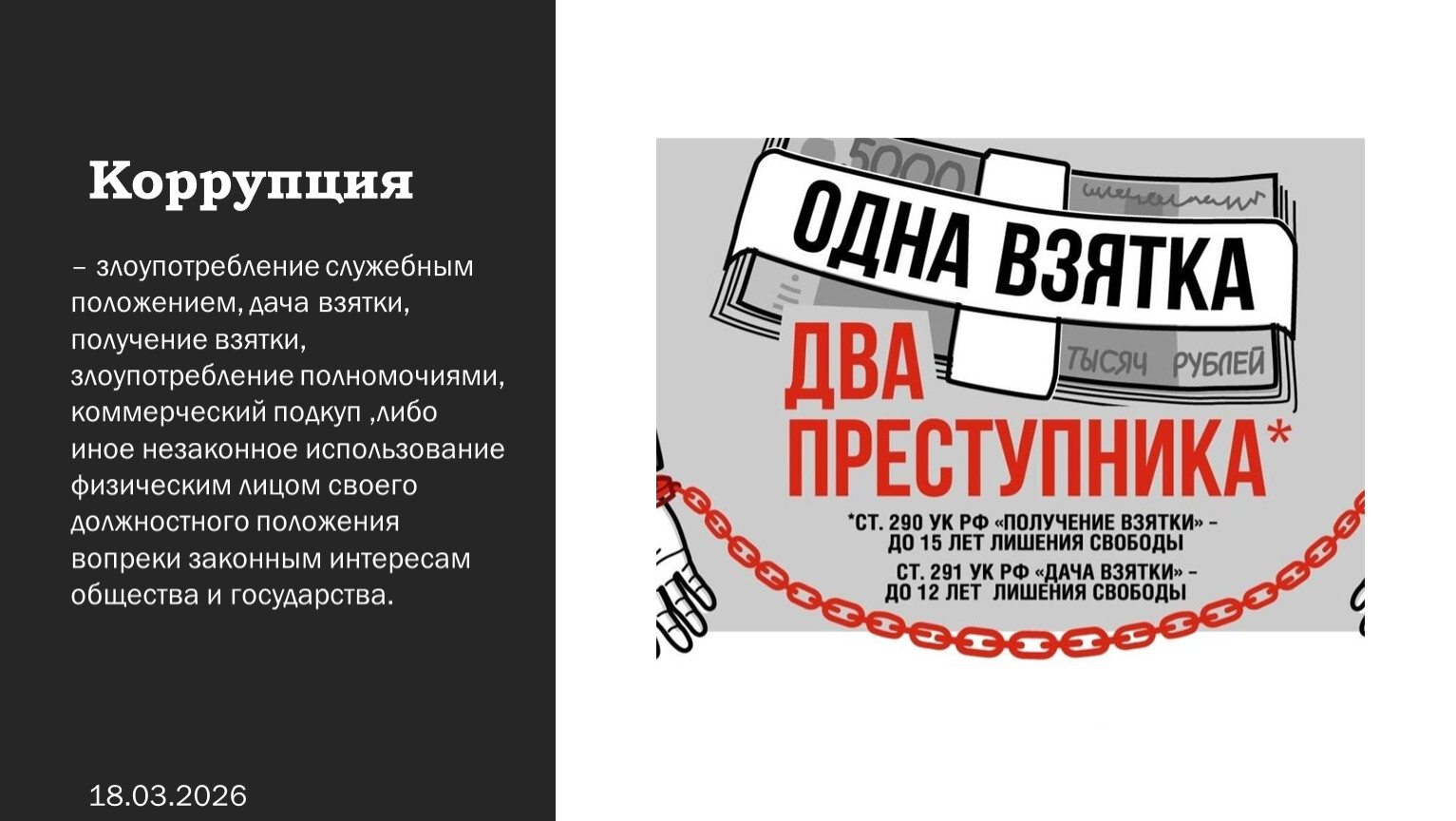 Согласно действующему российскому законодательству в понятие «коррупции» входит: