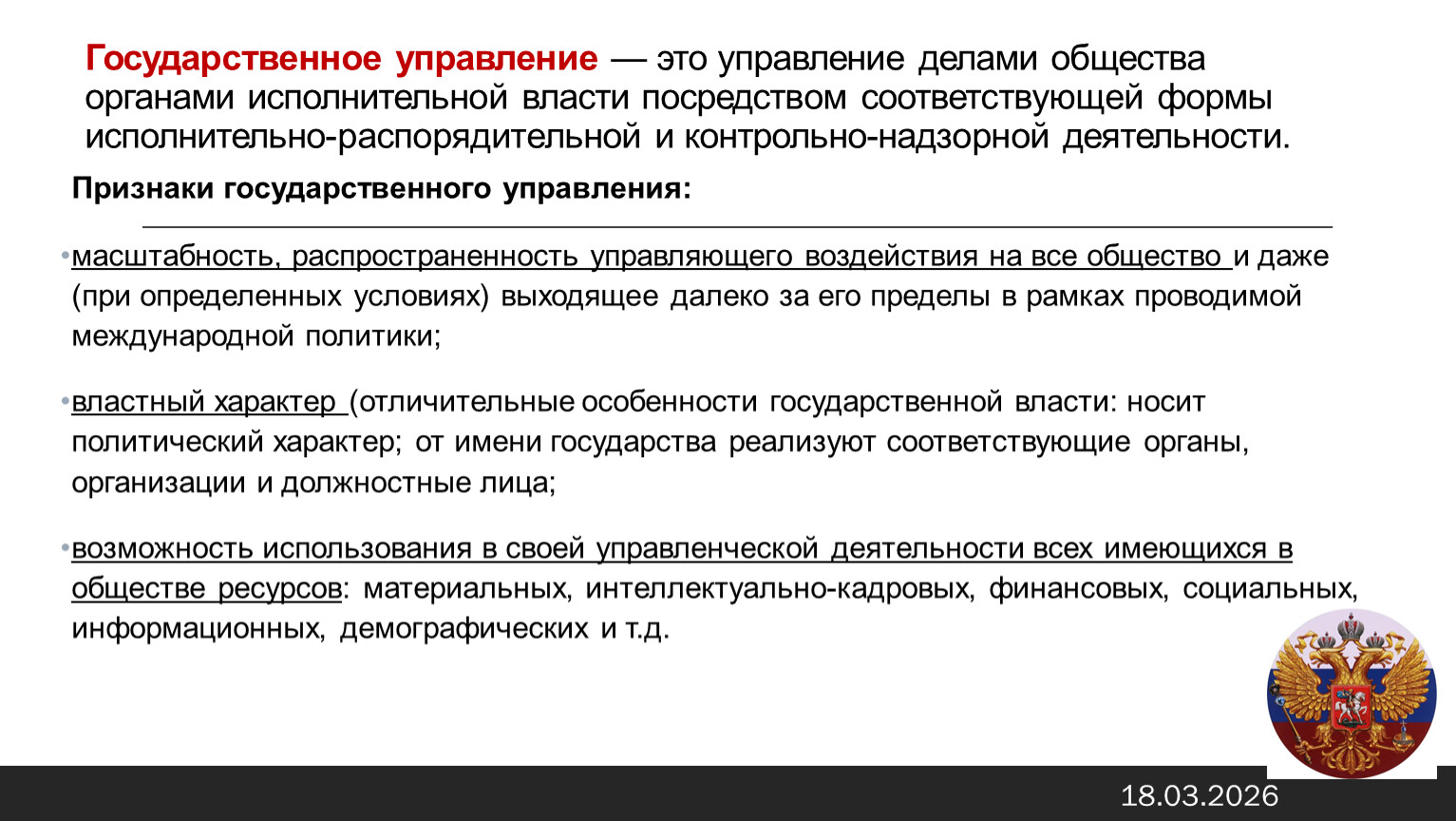 Государственное управление — это управление делами общества органами исполнительной власти посредством соответствующей формы исполнительно-распорядительной и контрольно-надзорной деятельности.