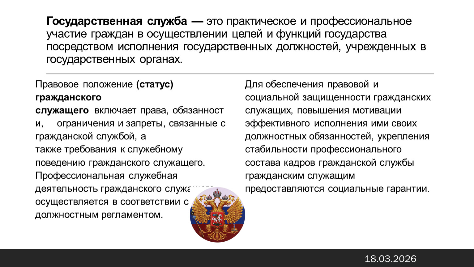 Государственная служба — это практическое и профессиональное участие граждан в осуществлении целей и функций государства посредством исполнения государственных должностей, учрежденных в государственных органах.