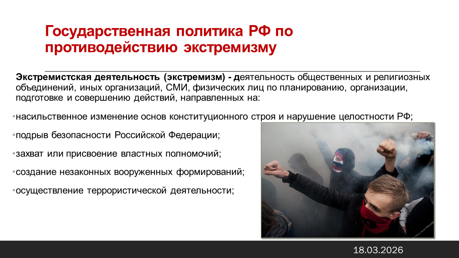 Экстремистская деятельность (экстремизм) - деятельность общественных и религиозных объединений, иных организаций, СМИ, физических лиц по планированию, организации, подготовке и совершению действий, направленных на: