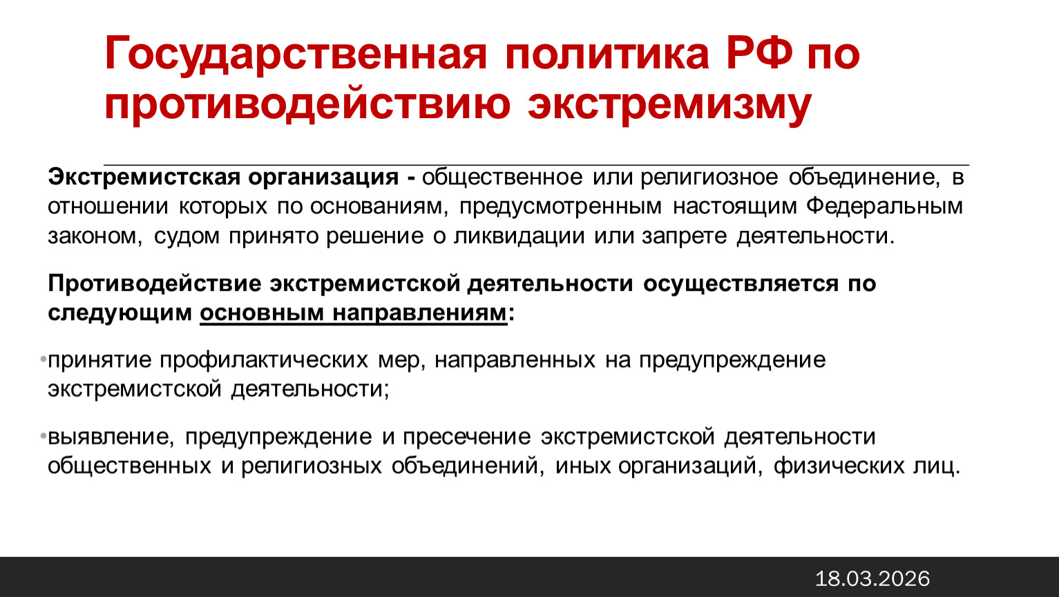 Противодействие экстремистской деятельности осуществляется по следующим основным направлениям:
