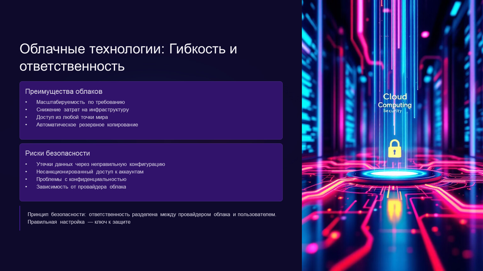 Принцип безопасности: ответственность разделена между провайдером облака и пользователем. Правильная настройка — ключ к защите