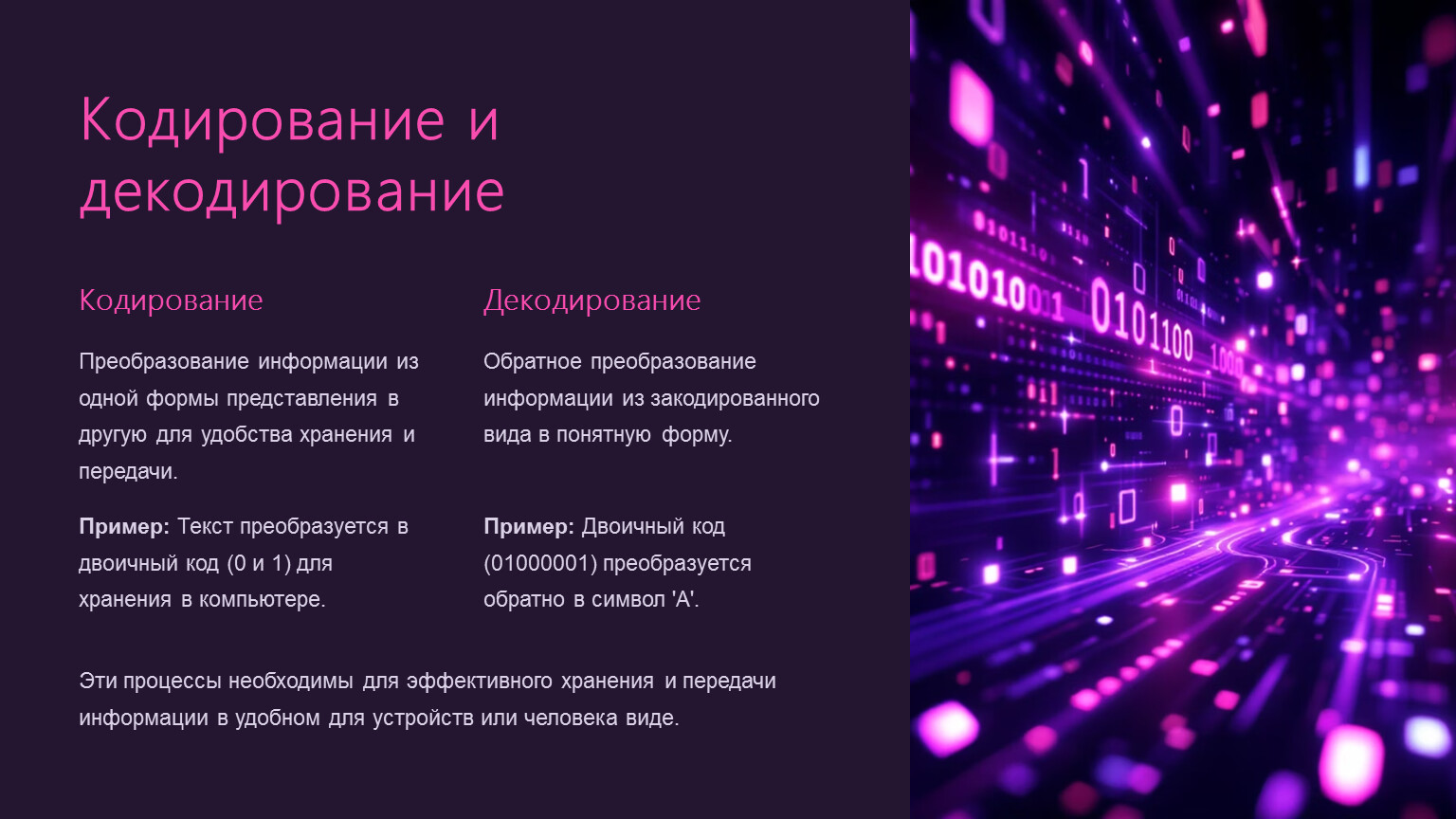 Пример: Текст преобразуется в двоичный код (0 и 1) для хранения в компьютере.