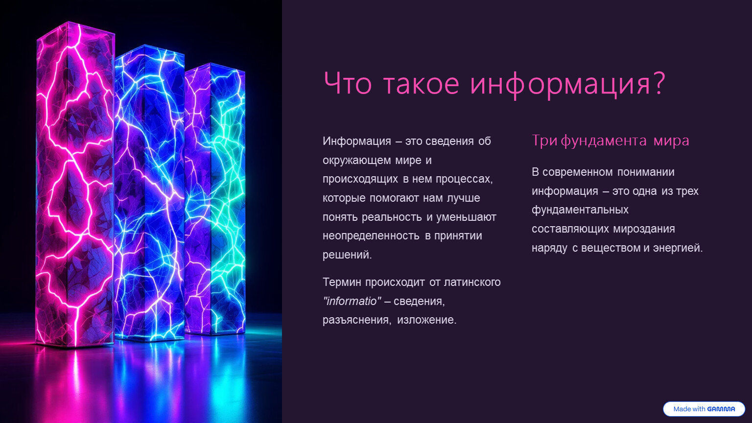 В современном понимании информация – это одна из трех фундаментальных составляющих мироздания наряду с веществом и энергией.