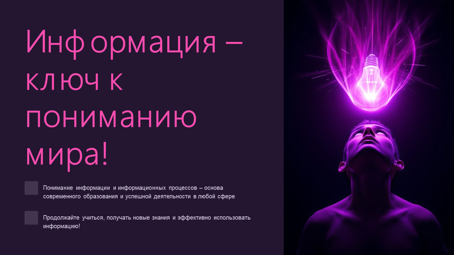Информация – это сведения об окружающем мире и происходящих в нем процессах, которые помогают нам лучше понять реальность и уменьшают неопределенность в принятии решений.
