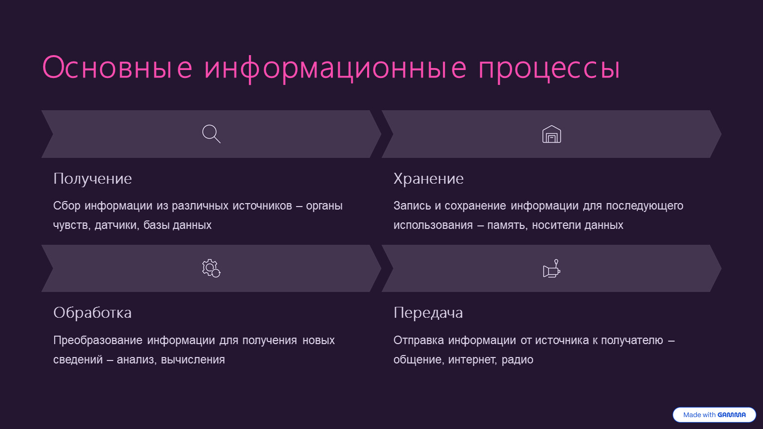 Информационные процессы – это действия, связанные с получением, хранением, обработкой и передачей информации в различных системах.