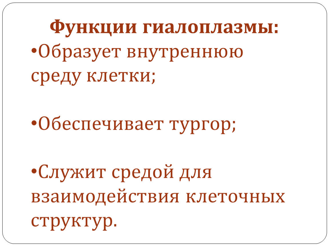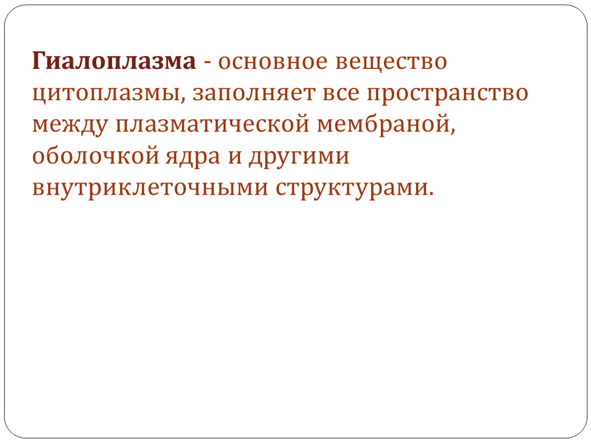 Гиалоплазма - основное вещество цитоплазмы, заполняет все пространство между плазматической мембраной, оболочкой ядра и другими внутриклеточными структурами.