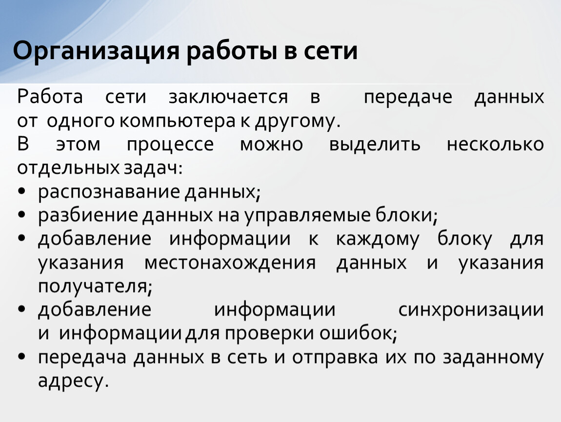 Работа сети заключается в передаче данных от одного компьютера к другому.
