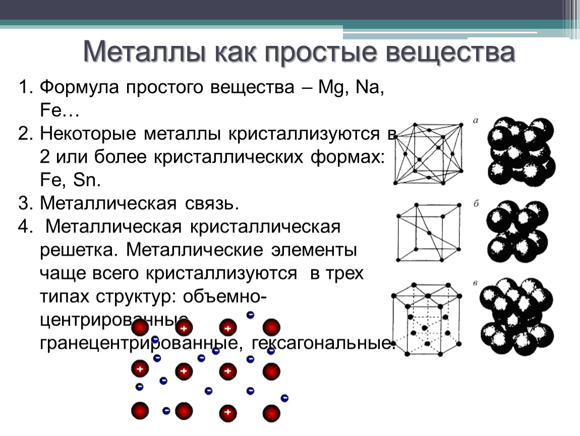 Металлическая кристаллическая решетка. Металлические элементы чаще всего кристаллизуются в трех типах структур: объемно-центрированные, гранецентрированные, гексагональные.