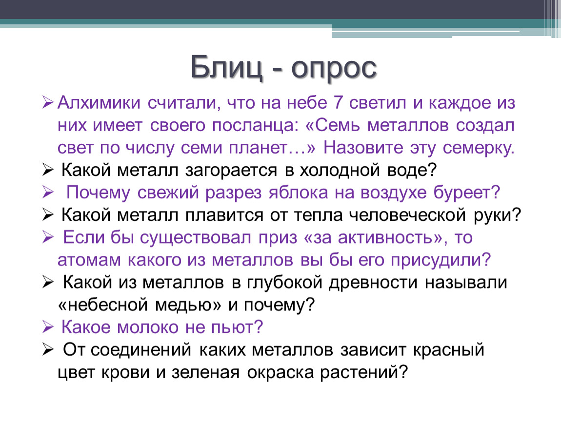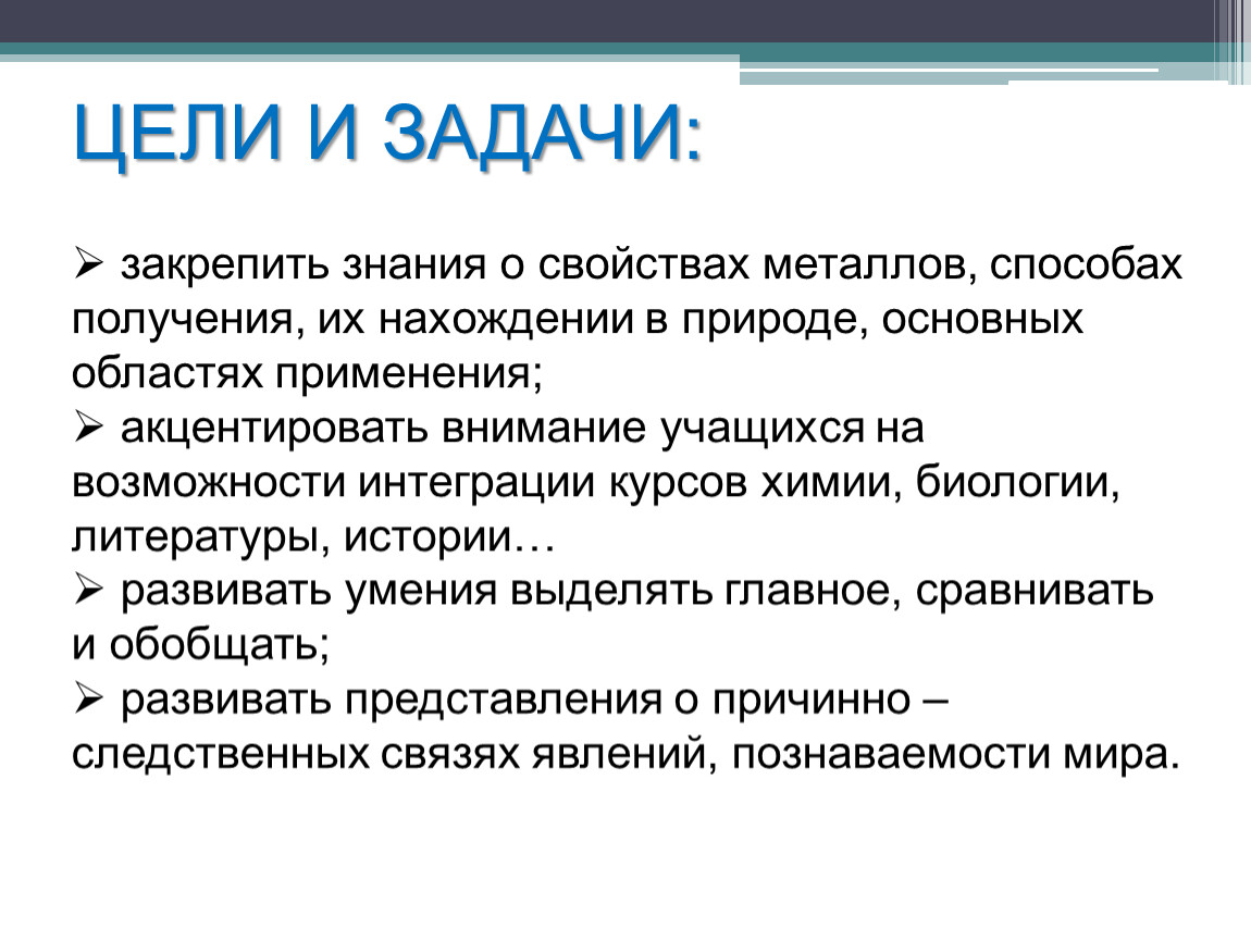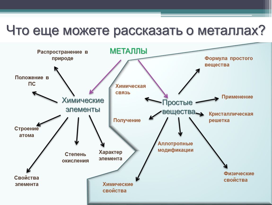 закрепить знания о свойствах металлов, способах получения, их нахождении в природе, основных областях применения;