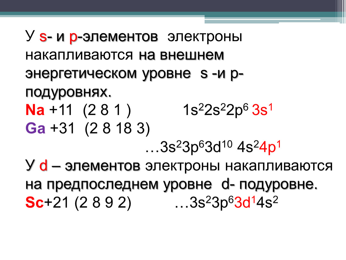 У s- и p-элементов электроны накапливаются на внешнем энергетическом уровне s -и p- подуровнях.