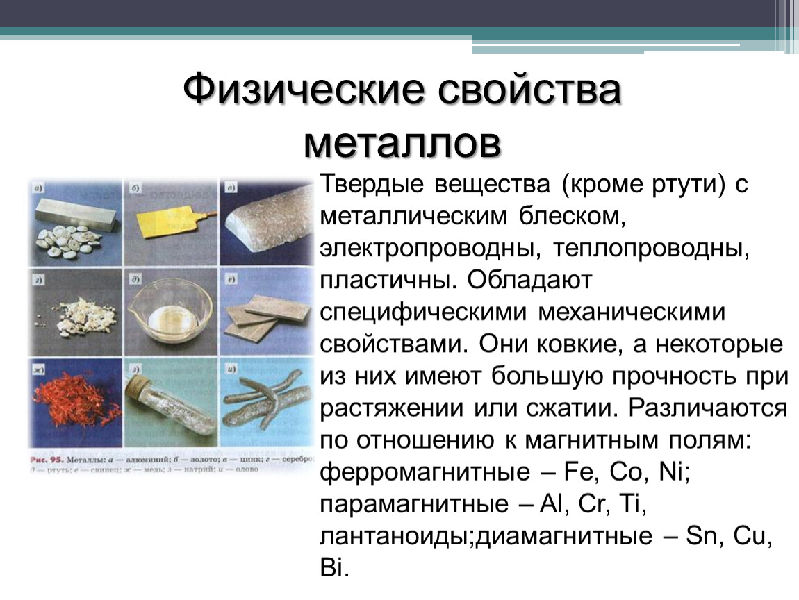Твердые вещества (кроме ртути) с металлическим блеском, электропроводны, теплопроводны, пластичны. Обладают специфическими механическими свойствами. Они ковкие, а некоторые из них имеют большую прочность при растяжении или сжатии. Различаются по отношению к магнитным полям: