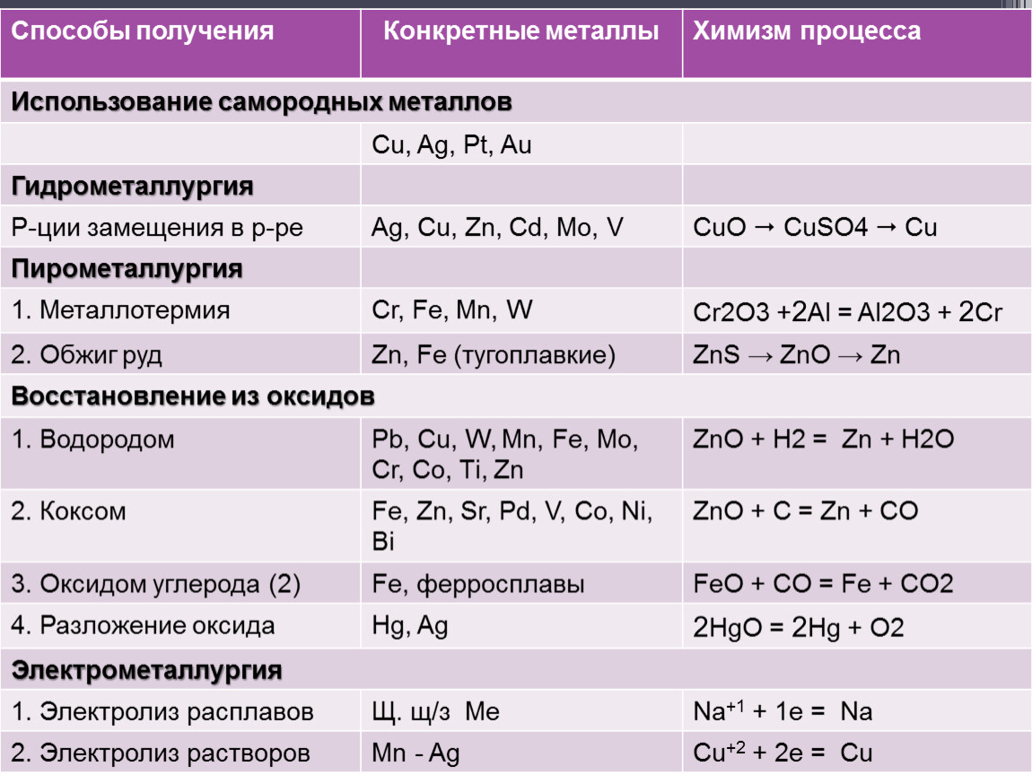 1. Металлотермия | Cr, Fe, Mn, W | Cr2O3 +2Al = Al2O3 + 2Cr |