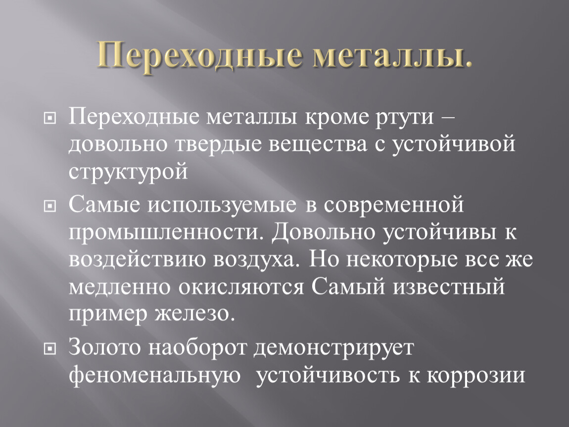 Переходные металлы кроме ртути – довольно твердые вещества с устойчивой структурой