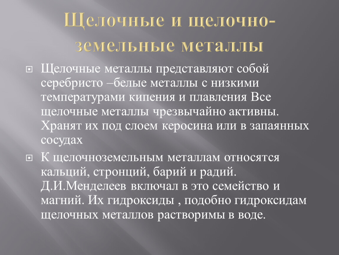 К щелочноземельным металлам относятся кальций, стронций, барий и радий. Д.И.Менделеев включал в это семейство и магний. Их гидроксиды , подобно гидроксидам щелочных металлов растворимы в воде.